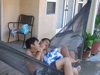 TODAY, went to Dee's house again for another pool party. When I got there she told me to go to the side gate, and I did, and all of a sudden, I heard someone say, "Hi Julie," and I didn't see anyone, I was still on the phone with Dee, and she told me to look up and I saw PETER ! He was stuck on the roof, and didn't know how to get down. ROFL Uber sad. Anyways, we tried everything to get him down, but he still wouldn't get down cause his fear got to his head, seriously, it was only a one story jump, I've even done it before. ANYWAYS, we waited for Nick to come and help him, and 1 hour later, we finally got him down. Soon we went swimming, and Brittany and Beverly came shortly after. Left around 6ish, and they went ice skating. Today was another good day, and tomorrow will be better. Why you ask ? CAUSE ISA IS TOMORROW ! WHOOOO ~